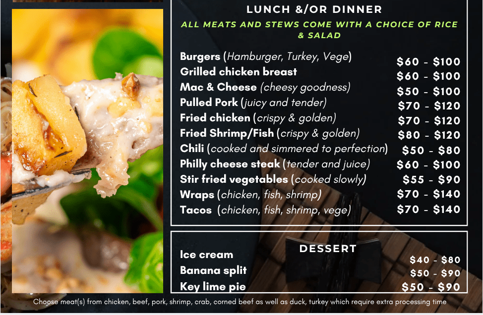 - Fish (Baked, Fried, Bar-B-Que’d) $25.00