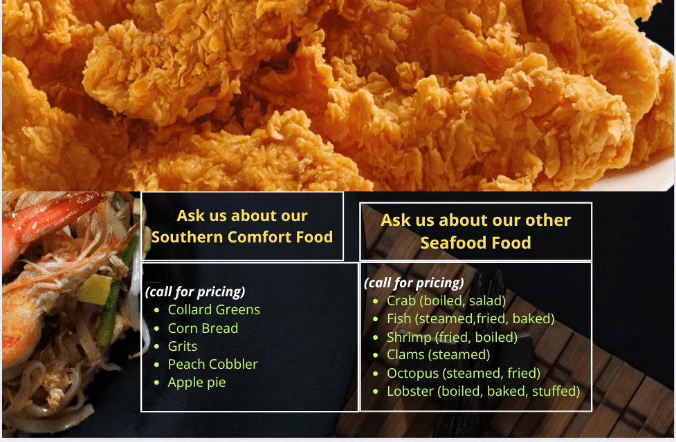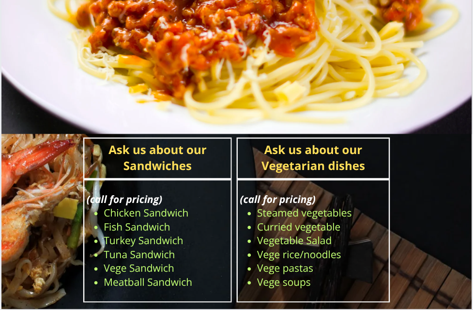 Our options below are just a small sample of the variety and selection of foods we prepare and serve. All items can be bought as a single item, a platter, or one or more of our different sized trays. If not on the menu ask us if we make it, or tell us what you want. We will try our best to accommodate your request.